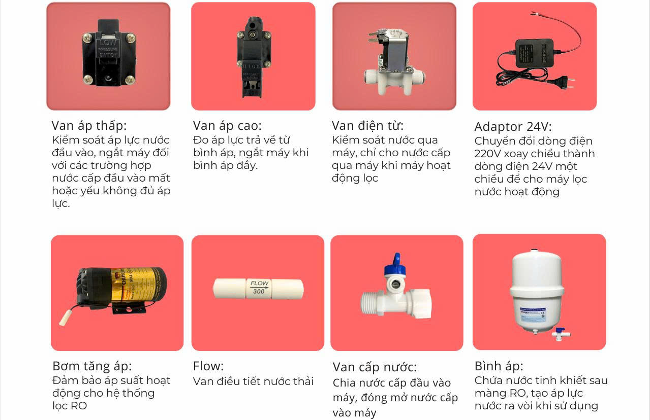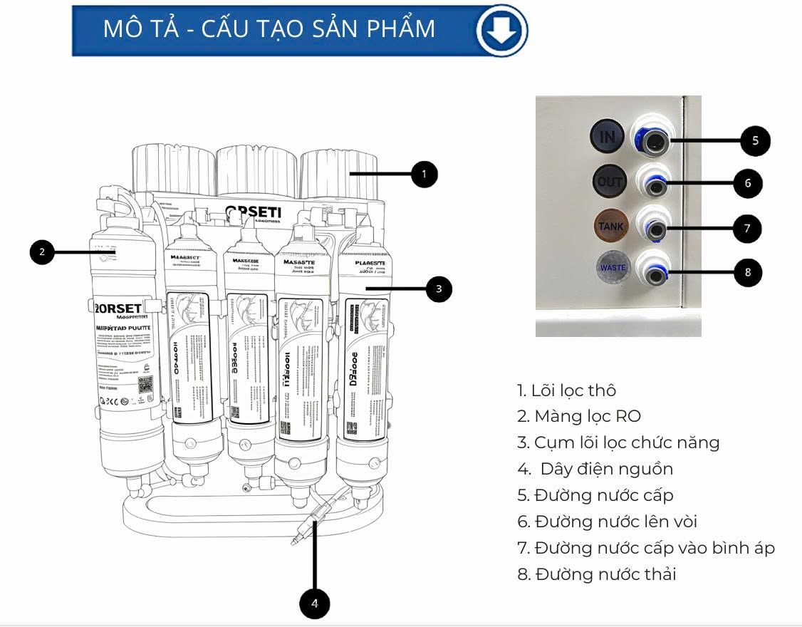 - Hệ thống màng RO và lõi lọc chức năng của máy đã được nhà cung cấp lắp đặt hoàn thiện, chỉ cần thao tác kiểm tra để đảm bảo không có hiện tượng rò rỉ nước.