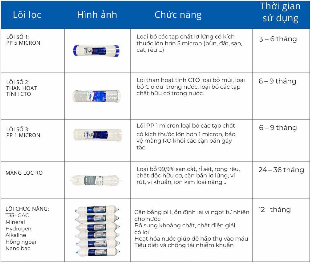 - Khuyến cáo trên được căn cứ trên điều kiện nước máy đầu vào đạt chuẩn. Trong thực tế thời gian thay thế lõi lọc có thể thay đổi phụ thuộc vào chất lượng nước cấp đầu vào và lưu lượng nước thực tế sử dụng.