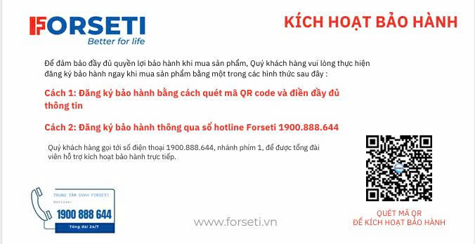 - Khuyến nghị sử dụng dịch vụ chính hãng khi thay thế lõi lọc, linh kiện máy lọc nước Forseti Mọi thắc mắc vui lòng liên hệ hotline 1900 888 644 để được hỗ trợ.