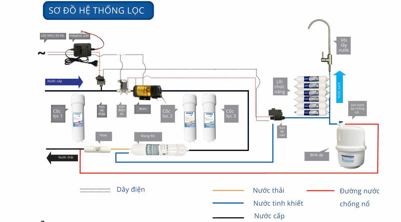 (*)Hệ thống lọc cần được sục rửa lần đầu sử dụng hoặc khi thay thế lõi lọc mới.